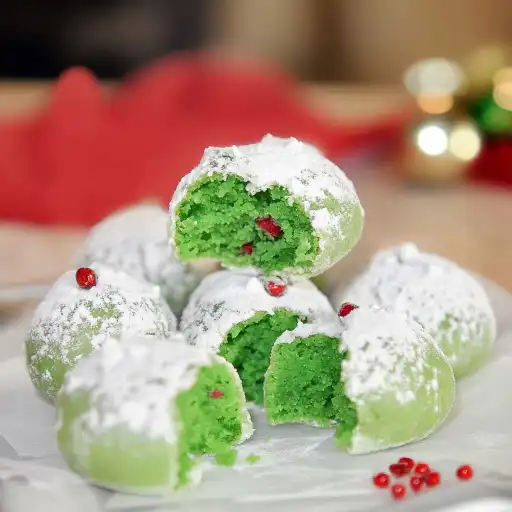 These whimsical Grinch Snowball Cookies are a delightful and festive treat perfect for the holiday season. Inspired by the classic Dr. Seuss character, these cookies boast a vibrant green hue, crunchy pecans, tart cranberries, and a dusting of powdered sugar, resembling miniature snowballs. A red heart sprinkle, held in place by melted white chocolate, adds the final touch of Grinchy charm. These cookies are not only visually appealing but also offer a delectable combination of flavors and textures that will delight both children and adults.