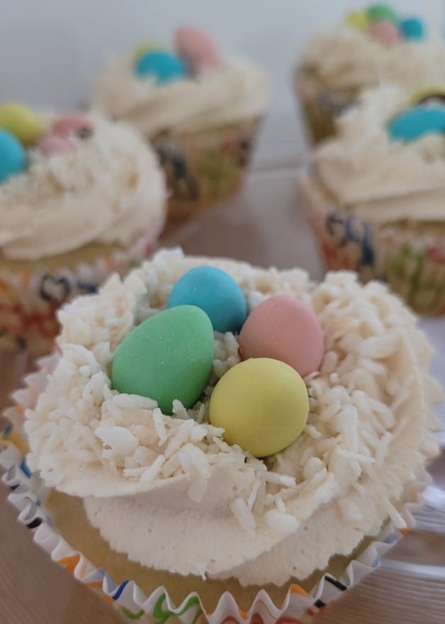 Sprinkle the toasted coconut generously over the frosted cupcakes. Then, place 3 to 4 chocolate mini eggs in the center of each cupcake to create a festive Easter nest look.
