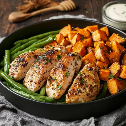Description: A vibrant and wholesome dish combining tender, honey-garlic glazed chicken with sweet roasted sweet potatoes and crisp-tender green beans. This one-pan meal is not only packed with flavor but is also a breeze to prepare, making it perfect for a weeknight dinner. The balance of savory, sweet, and slightly tangy flavors makes it a crowd-pleaser, while the combination of protein, healthy carbohydrates, and fiber ensures a nutritious and satisfying meal.