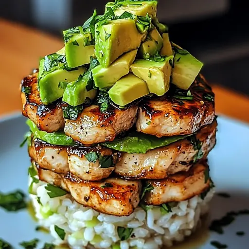 Step 6: Assemble the Stacks: To assemble the stacks, you can use a round mold, a cookie cutter, or a small bowl as a guide. Place the mold or bowl on a serving plate. Begin by layering a generous portion of the cilantro-lime rice at the bottom of the mold. Gently press down on the rice to create a firm base. Next, add a spoonful of the avocado mixture on top of the rice layer, spreading it evenly. Finally, top with the sliced grilled chicken.