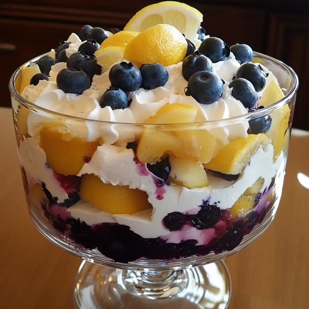 Description of this recipe: This Lemon Blueberry Trifle is a stunning and delicious dessert that layers the bright, tangy flavors of lemon curd with sweet blueberry jam, fresh blueberries, creamy whipped cream, and moist pound cake. It’s a visually appealing and incredibly satisfying treat, perfect for potlucks, parties, or any special occasion.