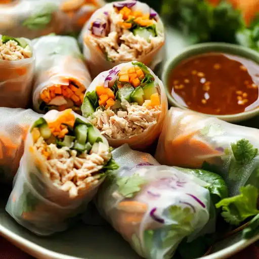 Step 10: Repeat and Serve Repeat the process with the remaining rice paper sheets and filling ingredients. As you finish each rice paper roll, place it on a serving plate, being careful not to stack them on top of each other, as they may stick together. Serve the Lemongrass Chicken Rice Paper Rolls immediately with the Vietnamese Peanut Dipping Sauce.