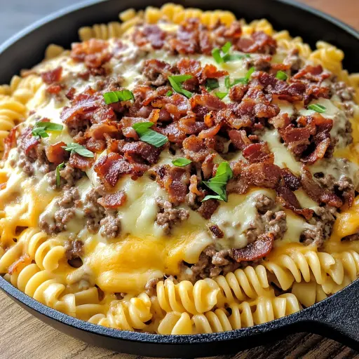 Step 7: Season and Serve: Season the loaded bacon cheeseburger pasta with salt and freshly ground black pepper to taste. Serve hot, garnished with crumbled bacon and chopped green onions.