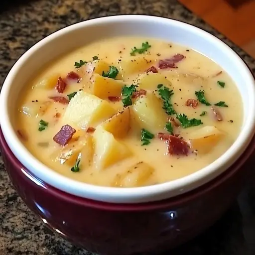 Description: A creamy, comforting soup that brings all the flavors of a loaded baked potato into a warm and satisfying bowl. This recipe combines tender potatoes, savory bacon, sharp cheddar cheese, and a hint of thyme for a delicious and hearty meal.
