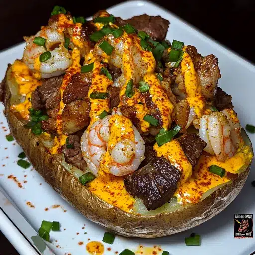 Description: Indulge in a culinary celebration with this loaded baked potato recipe! We’re talking perfectly baked russet potatoes piled high with tender steak, succulent chicken, plump shrimp, and an avalanche of your favorite toppings. This isn’t just a baked potato; it’s a complete, satisfying meal that’s bursting with flavor and texture. Get ready for a fiesta in your mouth!