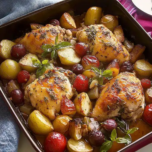 This Mediterranean Baked Chicken Dinner is a vibrant and flavorful one-pan meal that brings the taste of the Mediterranean to your table. Tender, juicy chicken pieces are baked to golden perfection alongside roasted potatoes, sweet red onions, and burst cherry tomatoes, all infused with a zesty lemon-herb marinade. It’s a complete, satisfying, and easy-to-clean-up meal that’s perfect for a weeknight dinner or a casual weekend gathering.