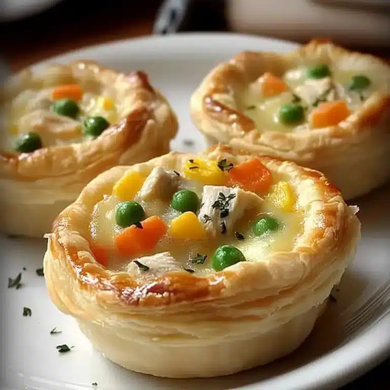 These Mini Chicken Pot Pies are individual servings of comfort food, perfect for a weeknight dinner or a cozy weekend lunch. They feature a creamy, savory filling of chicken, mixed vegetables, and a luscious cream of chicken soup base, all nestled inside flaky, golden-brown crescent roll crusts. They’re easy to make, customizable to your liking, and irresistibly delicious!