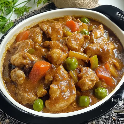 Description: A rich and flavorful Filipino stew, Chicken Caldereta is a comforting dish perfect for family meals. Tender chicken pieces are braised in a savory tomato-based sauce with vegetables, peanut butter, and a hint of spice, creating a symphony of flavors that will tantalize your taste buds. This version incorporates atsuete powder for a vibrant color and an even richer taste.