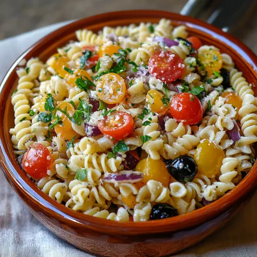 Step 5: Chill and Serve: Cover the bowl tightly with plastic wrap or transfer the pasta salad to an airtight container. Refrigerate for at least 30 minutes before serving, or preferably for a few hours. This allows the flavors to meld and deepen, creating a more harmonious and delicious salad. The chilling process also helps to firm up the pasta and vegetables, making them more refreshing to eat. Just before serving, give the pasta salad another gentle toss to redistribute the dressing. Garnish with extra fresh herbs, such as parsley or basil, for a pop of color and flavor. You can also sprinkle some grated Parmesan cheese over the top for a salty, savory touch.