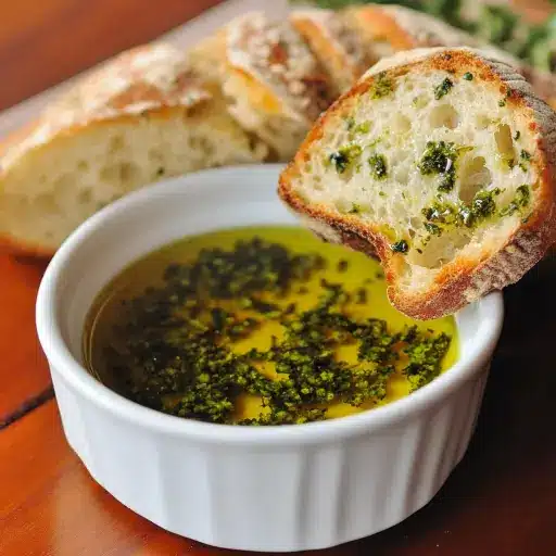 Step 6: Serve Transfer the prepared olive oil dip to a shallow serving dish. This allows for easy dipping with the bread. Serve immediately with slices of warm, crusty bread for the best experience. The warmth of the bread complements the flavors of the dip, creating a delightful combination.