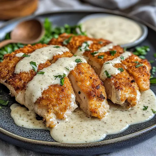 Description: This Parmesan Crusted Chicken is a simple yet elegant dish featuring tender, juicy chicken breasts coated in a flavorful Parmesan crust and drizzled with a luscious, creamy garlic sauce. Perfect for a weeknight dinner or a special occasion, this recipe is sure to impress with its delicious taste and easy preparation.
