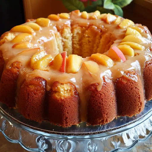 Step 11: Drizzle the Glaze and Add Topping Once the cake has cooled completely, drizzle the peach glaze over the top, allowing it to drip down the sides. Decorate with fresh or canned peach slices and sprinkle with cinnamon sugar for an extra touch of flavor and visual appeal. The glaze will set as it cools, creating a beautiful and delicious finish.