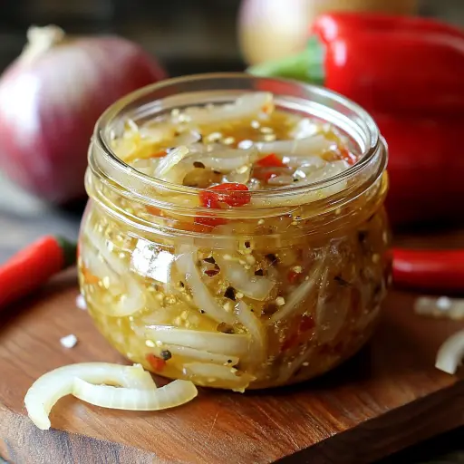 Description: A vibrant and tangy relish that adds a burst of flavor to any dish. This pickled pepper and onion relish is the perfect condiment to brighten up your meals, with the crispness of bell peppers and the bite of onions balanced by a sweet and sour brine. It’s incredibly versatile and easy to make, transforming ordinary sandwiches, burgers, and salads into culinary delights. Plus, it keeps well in the refrigerator, so you can enjoy it for weeks. The simple yet effective pickling process preserves the freshness of the vegetables while infusing them with a delightful combination of spices and tanginess. Whether you’re hosting a barbecue, packing a picnic, or just looking to elevate your everyday meals, this relish is a fantastic addition to your culinary repertoire. Get ready to savor the perfect blend of textures and flavors!