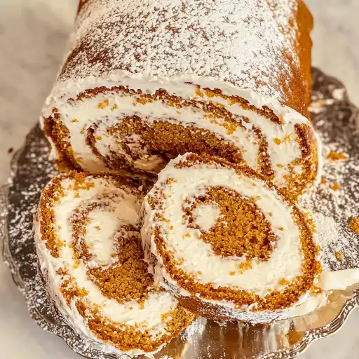 Step 11: Before serving, dust the Pumpkin Roll Cake with powdered sugar for an elegant finishing touch. Slice the cake into even pieces and arrange them on a platter.