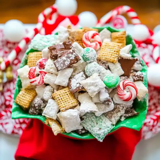 Description: Reindeer Chow, also known as Christmas White Chocolate Chex Mix, is a festive and incredibly addictive snack perfect for holiday gatherings, gift-giving, or simply enjoying by the cozy warmth of a fireplace. This delightful treat combines the satisfying crunch of Chex cereal with the sweetness of white chocolate, the playful colors of Christmas M&M’s, and the salty goodness of pretzels. A dusting of powdered sugar completes the enchanting, snowy effect, making it a visually appealing and irresistibly tasty snack that both kids and adults will adore.