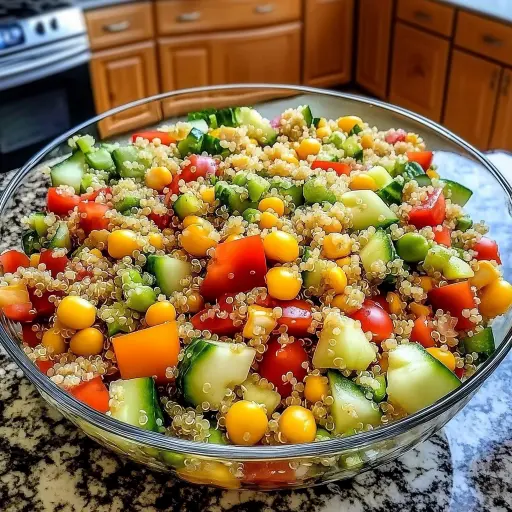 Step 4: Assemble the Salad: In a large salad bowl, combine the cooled quinoa, rinsed chickpeas, halved cherry tomatoes, diced cucumber, diced red bell pepper, corn kernels, chopped parsley or cilantro, and chopped red onion (if using).