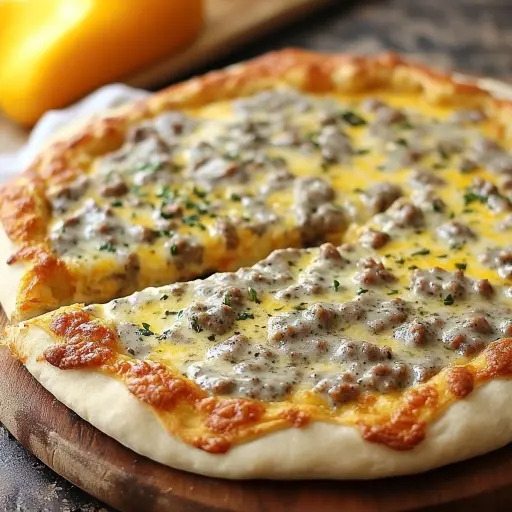 Description: A hearty and comforting breakfast pizza featuring a creamy sausage gravy, fluffy scrambled eggs, and melted cheese, all on a crispy pizza crust. Perfect for weekend brunch or a satisfying breakfast for a crowd.