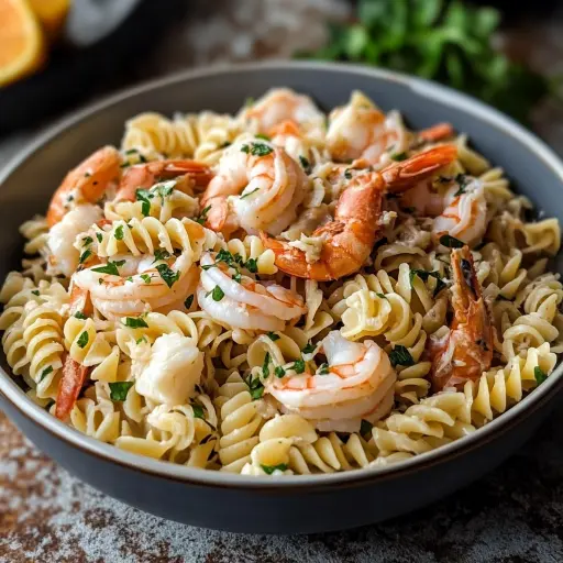 Description: A refreshing and creamy seafood pasta salad featuring succulent shrimp, sweet crab meat, and vibrant vegetables, all tossed in a tangy lemon-Dijon dressing. Perfect for a light lunch, summer gathering, or potluck.