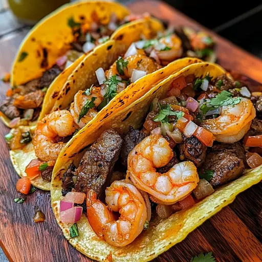 Description: These Shrimp and Steak Tacos are the ultimate taco combination, blending the succulent sweetness of juicy shrimp with the savory richness of tender steak for an unbelievably satisfying meal. Load them up with a vibrant array of fresh toppings and your favorite sauce for an extra burst of flavor that will dance on your taste buds! These tacos are perfect for a weeknight dinner, a weekend fiesta, or any occasion where you want to impress with minimal effort.