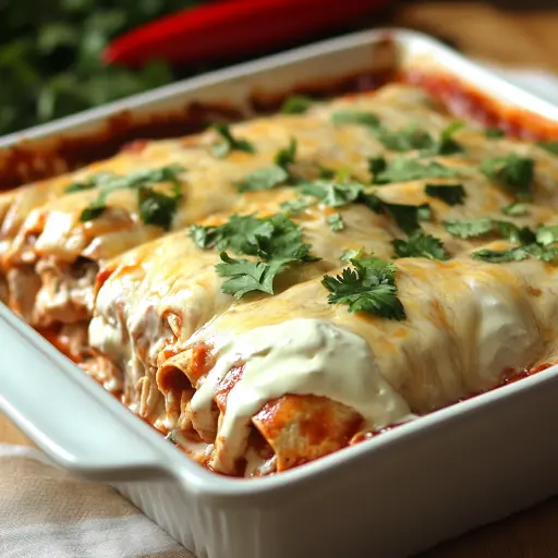 Description: This Sour Cream Chicken Enchilada Casserole is a delightful and comforting dish that combines the savory flavors of chicken enchiladas with the creamy richness of sour cream. It’s a layered casserole that’s easy to assemble and perfect for a family dinner or potluck. With tender shredded chicken, flavorful enchilada sauce, tangy sour cream, and melted cheese, this casserole is a guaranteed crowd-pleaser. Fresh cilantro adds a vibrant finishing touch, making it not only delicious but also visually appealing. Enjoy this simple yet satisfying meal that brings together the best of Tex-Mex flavors in one pan!
