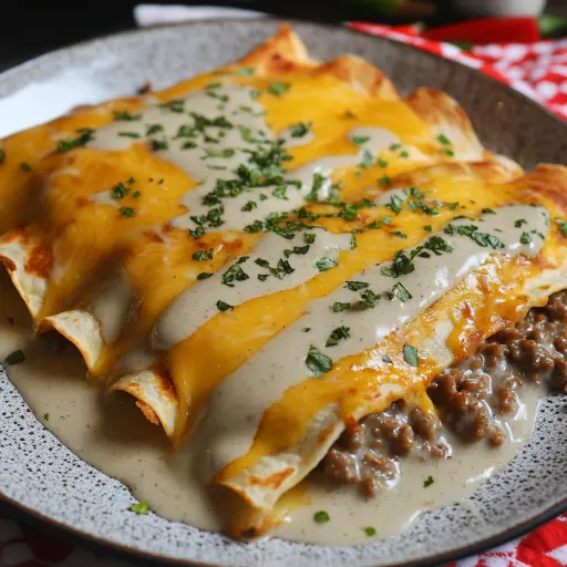 Description: Start your day with a fiesta of flavor! These Southern Breakfast Enchiladas combine the comforting heartiness of a sausage gravy breakfast with the fun and satisfying format of enchiladas. Soft flour tortillas are filled with fluffy scrambled eggs, melty cheeses, and optional breakfast potatoes for extra substance, then smothered in a creamy, savory sausage gravy. This is a guaranteed crowd-pleaser for brunch, potlucks, or any weekend breakfast. Get ready for a taste explosion!