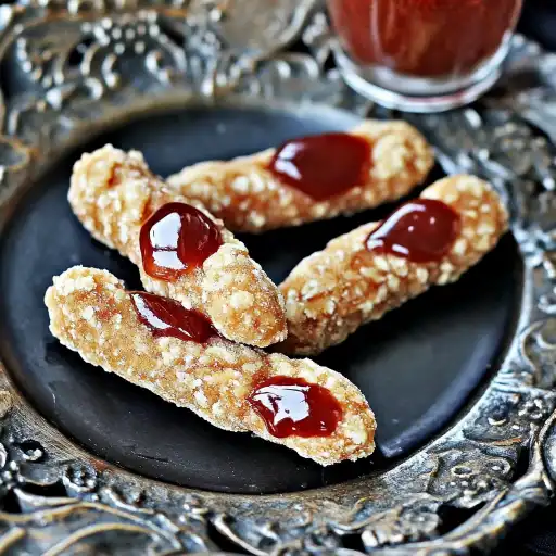 Description of this recipe: These Spooky Witches’ Fingers are a delightful and eerie treat, perfect for Halloween parties or any spooky-themed gathering. Made from a blend of cashews, dates, and coconut, these vegan and gluten-free “fingers” are not only fun to look at but also incredibly delicious and nutritious. They offer a healthier alternative to traditional Halloween candies, packed with natural sweetness and wholesome ingredients. The bright red “nail polish” made from strawberry preserves adds a touch of realism, while the almond slice creates a perfectly creepy fingernail.