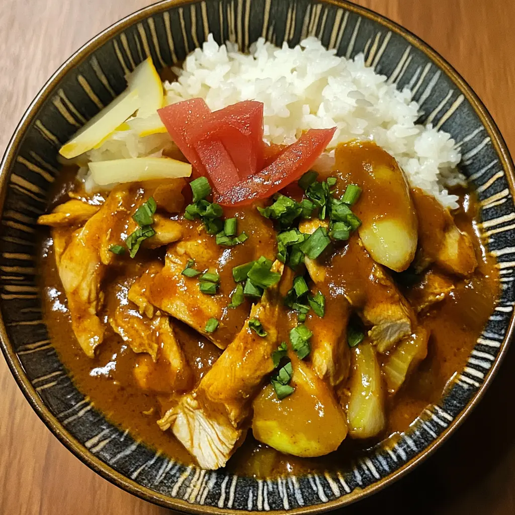 Step 8: Serve and garnish. Serve the Japanese Chicken Curry hot over cooked short-grain white rice. Garnish with sliced spring onions for a pop of color and a fresh, mild onion flavor. Serve with Japanese pickles, if desired, to add a tangy and refreshing contrast to the rich curry.