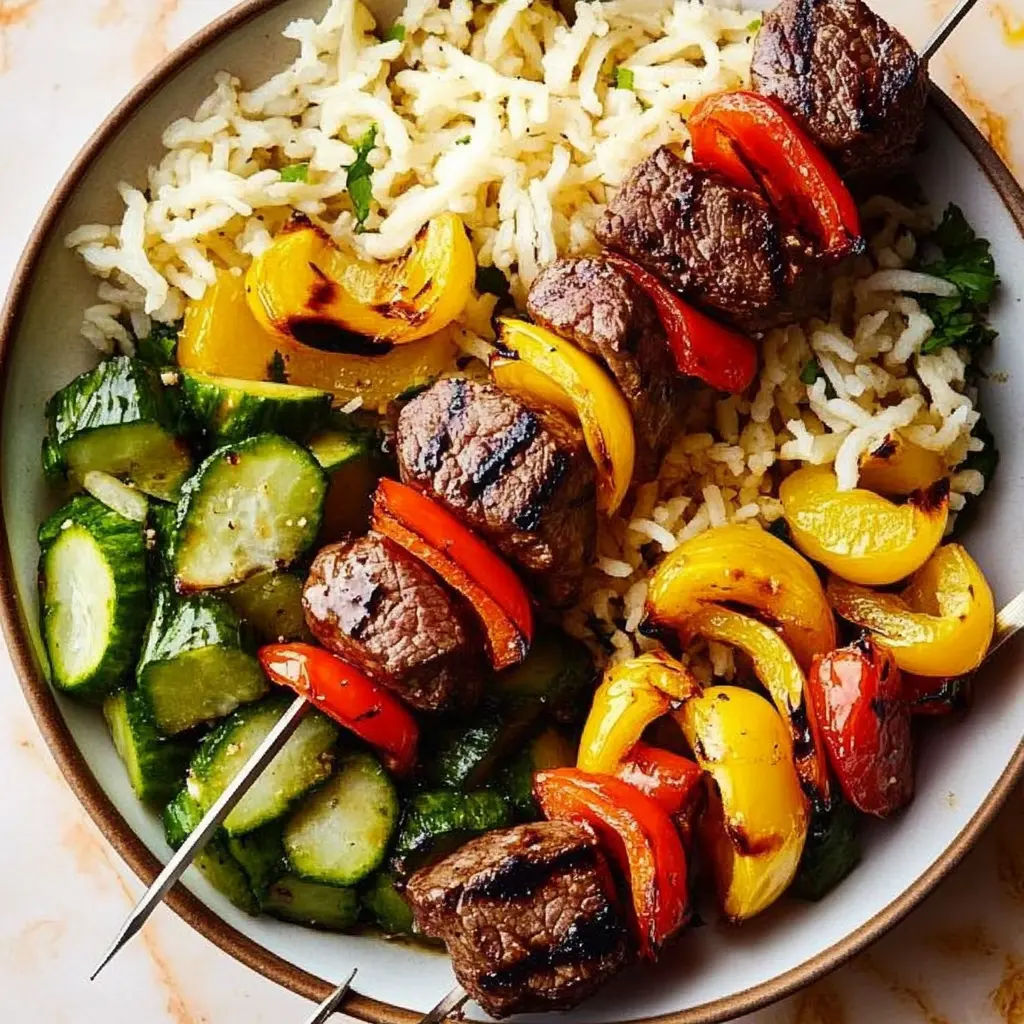 Description of this recipe: This recipe brings together the classic flavors of steak kebabs with a refreshing Mediterranean twist. Tender, marinated sirloin steak is grilled to perfection alongside colorful vegetables, then served atop a bed of creamy tahini-dressed cucumbers and spinach, and hearty lemon-infused orzo.