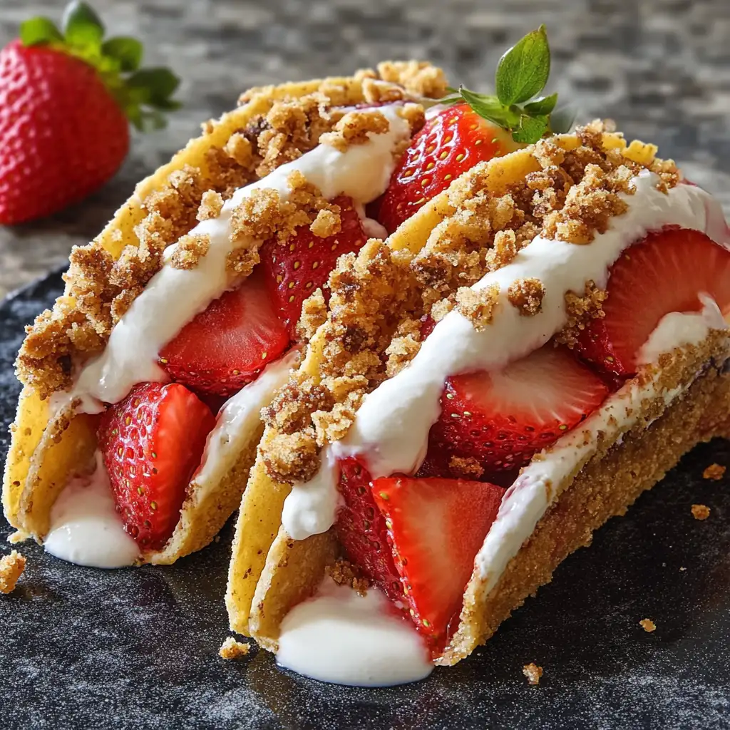 Strawberry Crunch Cheesecake Tacos are a delightful fusion of textures and flavors, combining the crispy, buttery crunch of homemade taco shells with a creamy, tangy cheesecake filling, all topped with fresh strawberries and a drizzle of sweet strawberry syrup. This innovative dessert is a playful twist on traditional cheesecake, presented in a fun, handheld format that’s perfect for parties, gatherings, or simply a special treat. The combination of the crunchy shell, the smooth cheesecake filling, and the burst of fresh strawberry flavor creates an irresistible dessert experience that’s both satisfying and visually appealing.