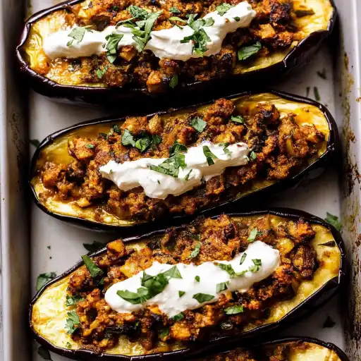 This Stuffed Eggplant recipe features tender, roasted eggplant halves topped with a flavorful spiced meat mixture, creating a delicious and satisfying meal. The dish is finished with a refreshing dollop of yogurt, fresh coriander, and toasted pine nuts, adding layers of texture and taste. This recipe is a delightful combination of Mediterranean and Middle Eastern flavors, perfect for a weeknight dinner or a special occasion.
