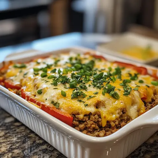 Description: This deconstructed stuffed pepper casserole reimagines the classic comfort food into an easily assembled, flavor-packed dish. Combining savory ground beef, vibrant bell peppers, juicy tomatoes, and fluffy rice, all topped with a blanket of melted cheddar cheese, this casserole is a weeknight dinner winner that’s both satisfying and customizable.