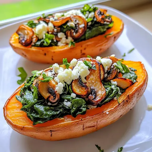 Description: These stuffed sweet potatoes are a vibrant and flavorful vegetarian meal, brimming with earthy mushrooms, tender spinach, salty feta cheese, and fragrant rosemary. A bright lemon-garlic dressing adds a tangy finish, making each bite a delightful experience. These are easily customizable and offer a satisfying and healthy way to enjoy a nutritious and delicious meal.