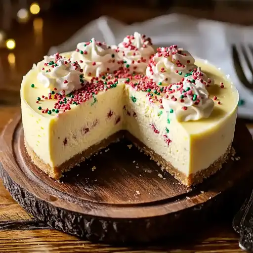 Once the cheesecake is chilled, remove it from the springform pan. To do this, carefully run a thin knife around the edge of the cheesecake to loosen it from the pan. Then, release the springform latch and gently lift the cheesecake from the base of the pan. Garnish with whipped cream, sugar sprinkles, and fresh berries, if desired. Slice and serve chilled. Enjoy your homemade Sugar Cookie Cheesecake!