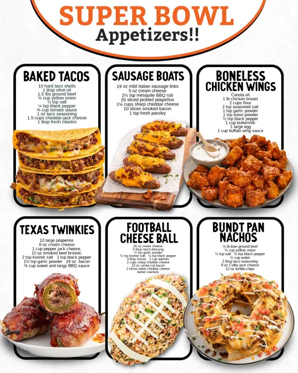 Hosting game day? These Super Bowl appetizer recipes are guaranteed crowd-pleasers! This ultimate party food roundup includes baked tacos, sausage boats, boneless buffalo chicken wings, Texas Twinkies, a classic football cheese ball, and bundt pan nachos. Perfect for Super Bowl parties, tailgating, and game day snacks, these easy appetizers are cheesy, hearty, and full of bold flavor. Save this pin for the best Super Bowl food ideas and stress-free party planning!