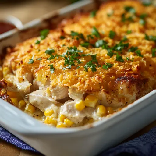 Description: Indulge in the comforting warmth of this Sweet Corn & Cajun Chicken Bake, crowned with a crispy, golden cheddar crust. This flavorful casserole combines tender shredded chicken, sweet corn, vibrant bell peppers, and aromatic Cajun spices, all nestled in a creamy sauce and baked to perfection. It’s a delightful dish that’s both easy to prepare and sure to satisfy your comfort food cravings. This recipe is your passport to a hassle-free, crowd-pleasing meal, perfect for busy weeknights or cozy weekend gatherings.