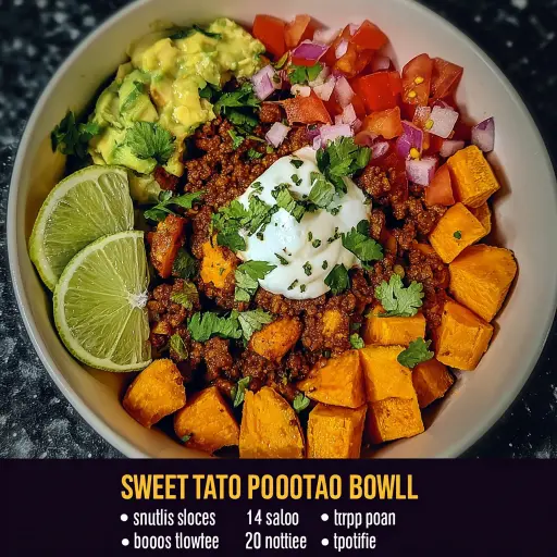 Description: Packed with bold flavors + a perfect dinner win 🥇 This vibrant Sweet Potato Taco Bowl recipe combines the heartiness of seasoned ground beef with the sweetness of roasted sweet potatoes, all topped with fresh guacamole, pico de gallo, and a dollop of sour cream. It’s a delicious and nutritious meal that’s both easy to prepare and satisfying to eat. Perfect for a weeknight dinner or a fun weekend gathering.