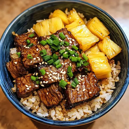 Description: A vibrant and flavorful bowl featuring tender, marinated beef, sweet pineapple, and fluffy rice, all drizzled with a luscious teriyaki sauce. This Teriyaki Beef & Pineapple Rice Bowl is a delightful combination of savory and sweet flavors, perfect for a quick and satisfying meal. The beef is marinated in a homemade teriyaki sauce, then stir-fried to perfection with juicy pineapple chunks, creating a dish that’s both delicious and visually appealing. Served over a bed of fluffy rice and garnished with green onions and sesame seeds, this bowl is a complete meal that’s sure to become a family favorite.