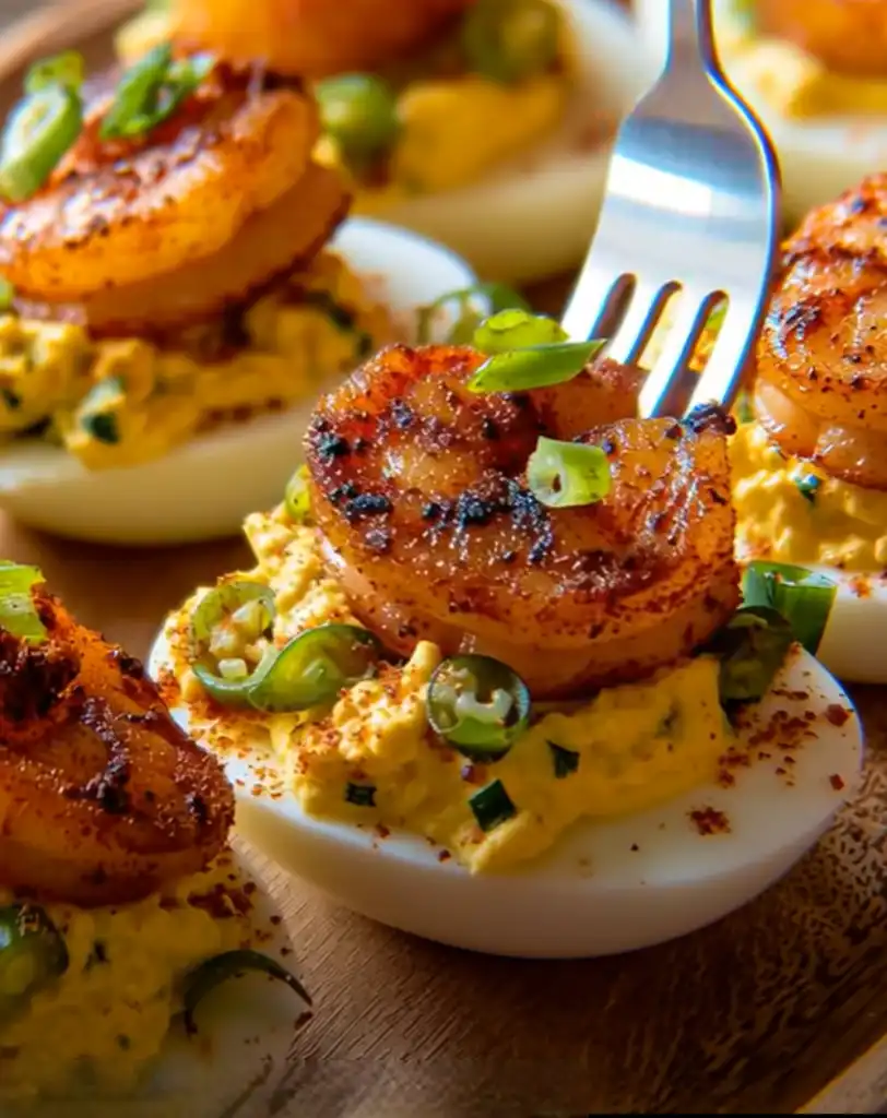 Step 5: Assemble: Transfer the yolk mixture to a piping bag or a Ziploc bag with a corner snipped off. Pipe the mixture evenly into the egg white halves. Top each egg half with a seared shrimp. Garnish with additional green onions, a sprinkle of Cajun seasoning, or a small piece of jalapeño, if desired, for added visual appeal and flavor.