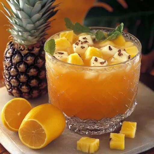 Description: Refreshing, tangy, and full of tropical flavor, this Pineapple Lemonade Punch is perfect for any party or sunny day! A delightful blend of pineapple, lemonade, and a splash of citrus that will keep you coming back for more! This recipe elevates the classic lemonade by incorporating the vibrant taste of pineapple, adding a tropical twist that is both exciting and comforting. Whether you’re hosting a summer barbecue, a birthday party, or simply want a delightful drink to brighten your day, this Pineapple Lemonade Punch is the answer. It’s easy to make, visually appealing, and sure to be a crowd-pleaser, offering a symphony of flavors that dance on your palate. Prepare to be transported to a sunny beach with every sip! The beauty of this recipe lies in its simplicity and adaptability. You can easily adjust the sweetness, tanginess, and fizziness to suit your personal preferences. For those who prefer a bolder flavor, a splash of ginger ale can add an extra layer of complexity. If you’re looking for a healthier version, consider using natural sweeteners like agave nectar or stevia. The possibilities are endless, making this punch a versatile choice for any occasion. The presentation of this punch is just as important as its taste. The vibrant colors of the pineapple juice, lemonade, and citrus fruits create a visually stunning drink. Garnishing with pineapple slices, lime wedges, and even edible flowers can elevate the presentation, making it a centerpiece of your party or gathering. Consider serving it in a clear glass pitcher or a decorative punch bowl to showcase its beautiful colors. Don’t be surprised if your guests are reaching for seconds (and thirds!). This Tropical Pineapple Lemonade Punch is so irresistibly delicious that it will quickly become a family favorite. Its unique combination of flavors and refreshing qualities make it a perfect choice for any season, whether you’re cooling off on a hot summer day or adding a touch of sunshine to a gloomy winter afternoon. Get ready to impress your friends and family with this easy yet extraordinary recipe.