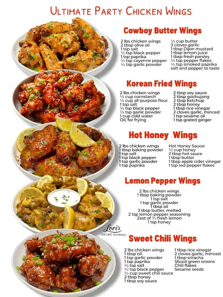 Hosting a party or game day get-together? These ultimate party chicken wings bring bold flavor with every bite! Featuring cowboy butter wings, Korean fried wings, hot honey wings, lemon pepper wings, and sweet chili wings, this wing roundup is perfect for game day, Super Bowl parties, tailgating, and family gatherings. Crispy, saucy, and easy to make—these wing recipes are guaranteed crowd-pleasers. Save this pin for your next party menu or wing night!