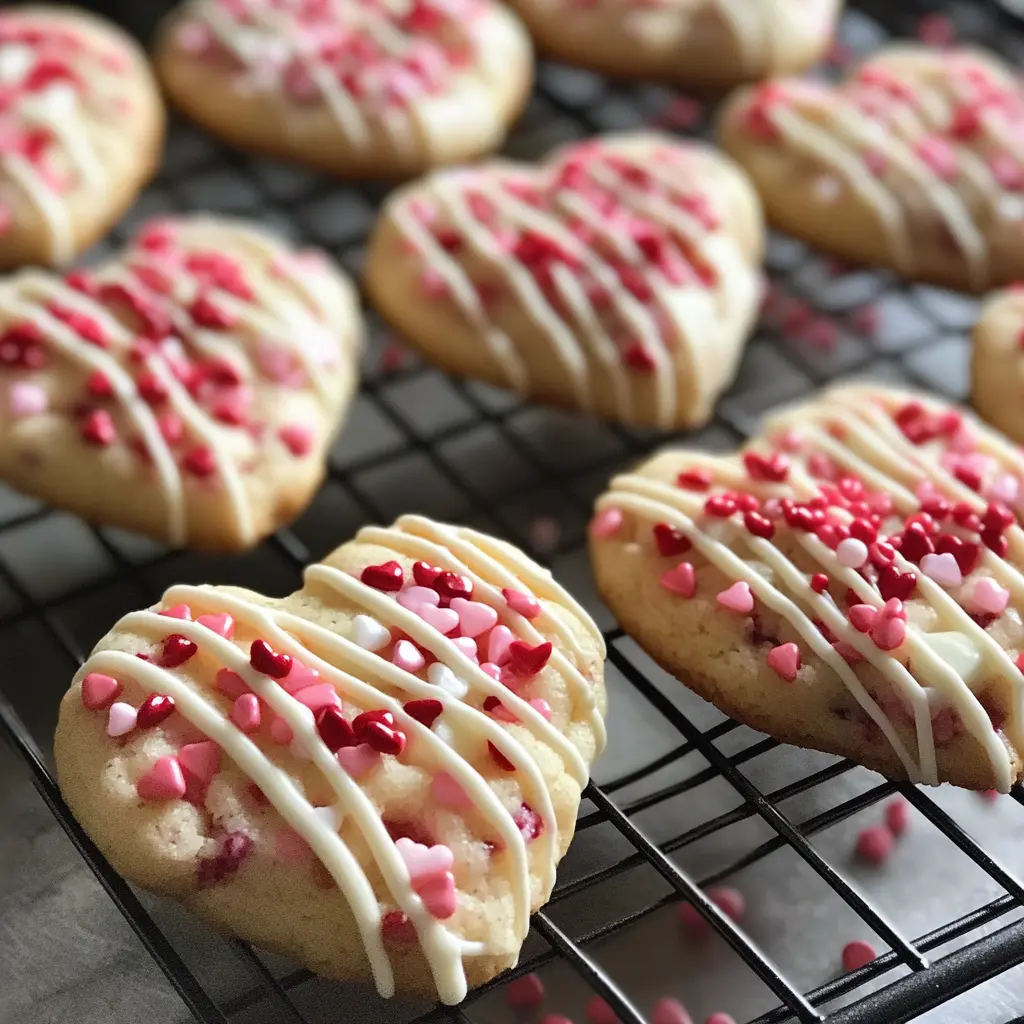 Step 7: Once the cookies are completely cool, drizzle the melted white chocolate over the tops using a spoon or a piping bag. While the drizzle is still wet, sprinkle red and pink sprinkles on top for a festive touch.
