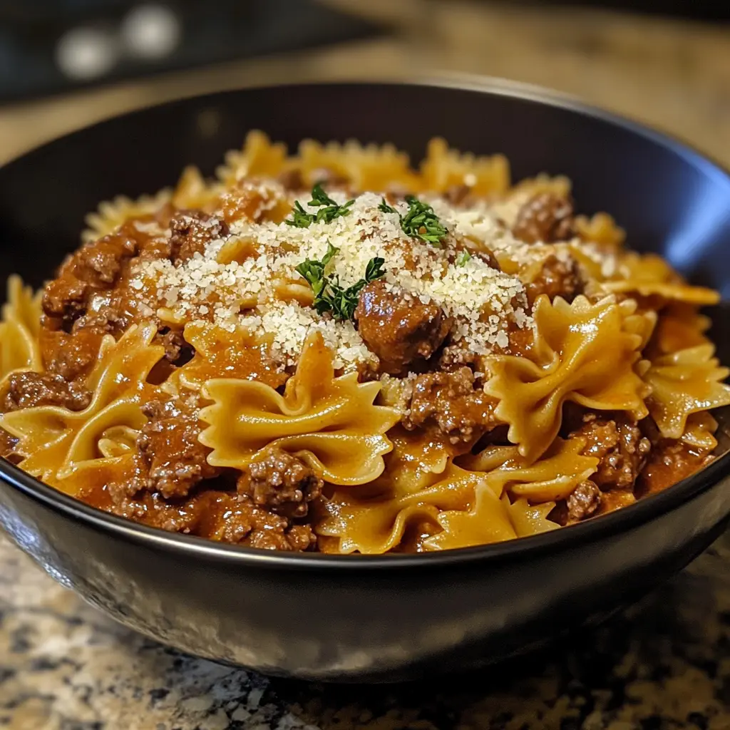 Add the cooked bowtie pasta to the skillet, tossing gently to coat the pasta evenly with the cheesy beef sauce. Make sure every piece of pasta is enveloped in that creamy goodness.