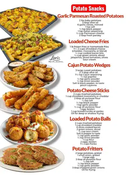 Potato lovers, this one’s for you These easy potato snack recipes are crispy, cheesy, and perfect for any occasion! This must-save collection includes garlic parmesan roasted potatoes, loaded cheese fries, cajun potato wedges, potato cheese sticks, loaded potato balls, and classic potato fritters. Great for game day snacks, party appetizers, or comfort food cravings, these simple potato recipes are guaranteed crowd-pleasers. Save this pin for the best potato snack ideas and irresistible appetizer inspiration!