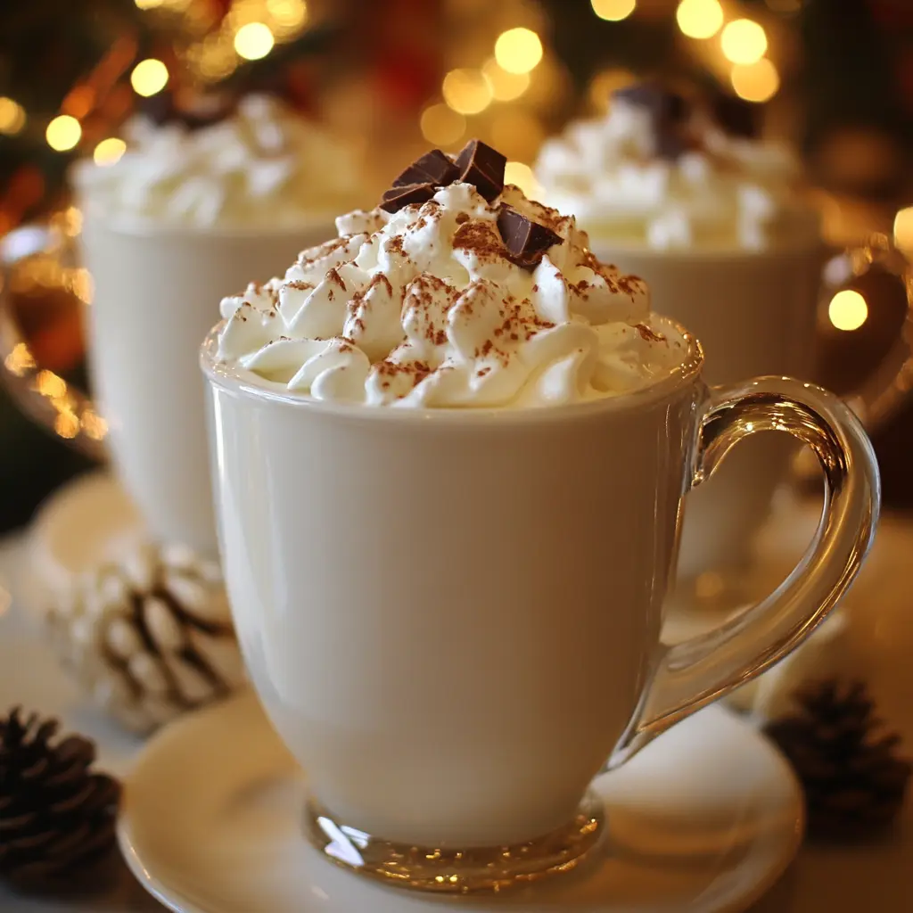 Step 6: Top each mug with a dollop of whipped cream, a sprinkle of extra white chocolate chips, and marshmallows. For an extra festive touch, add crushed candy canes on top for a peppermint twist.